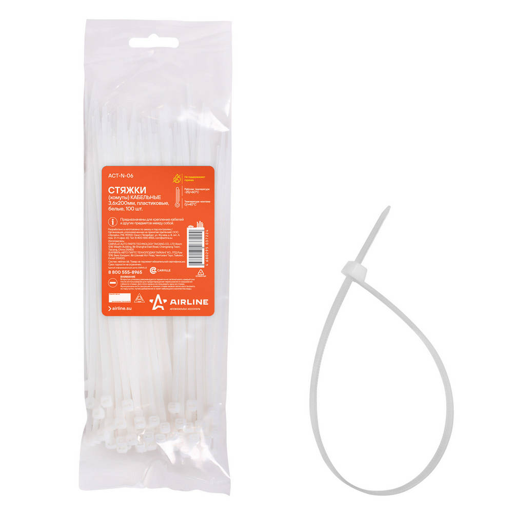 Стяжки (Хомуты) Кабельные 3,6200 Мм, Пластиковые, Белые, 100 Шт. AirLine ACTN06