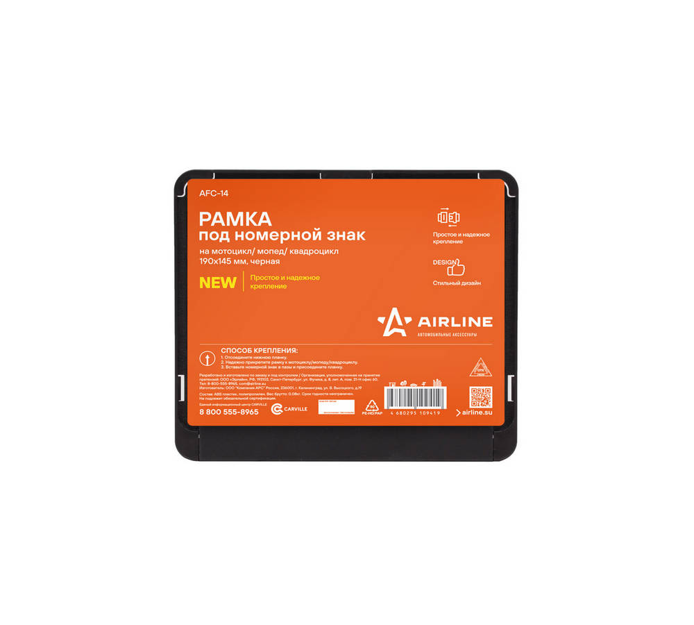 Рамка Под Номерной Знак На Мотоцикл/Мопед/Квадроцикл, 190Х145 Мм, Черная AirLine AFC14