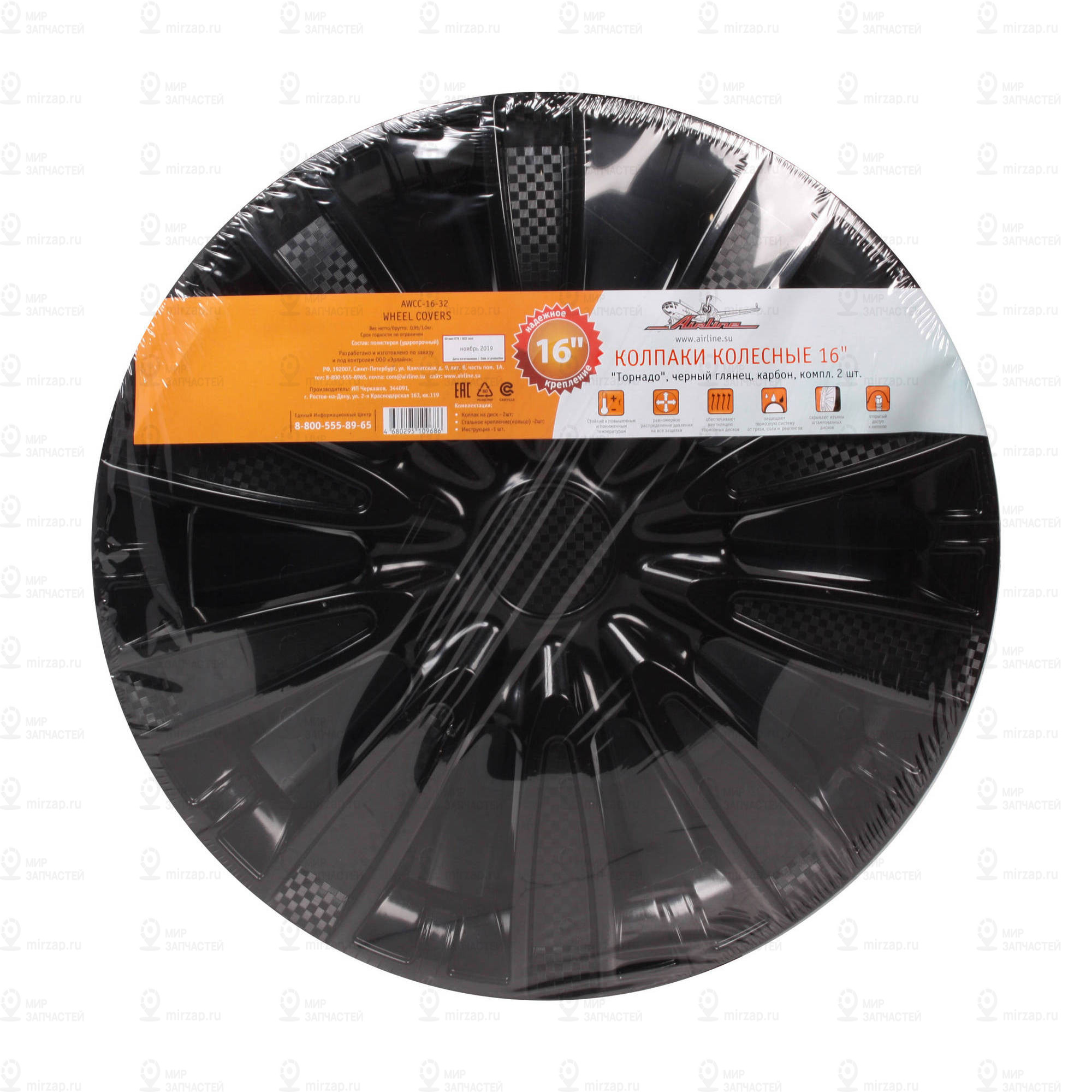 Колпаки Колесные 16 Торнадо, Черный Глянец, Карбон, Компл. 2 Шт. AIRLINE AWCC1632